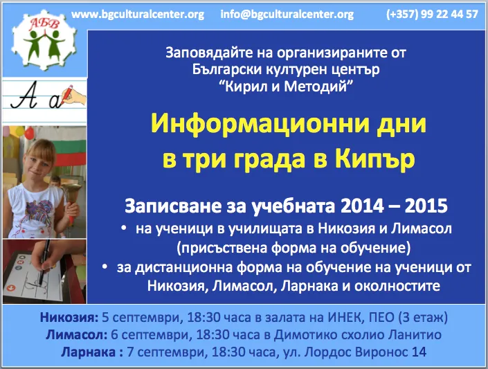 Никозия: 5 септември , 18: 30 часа в залата на ИНЕК, ПЕО (3 етаж); Лимасол: 6 септември, 18:30 часа в Димотико схолио Ланитио; Ларнака: 7 септември, 18:30 часа, ул. Лордос Виронос 14