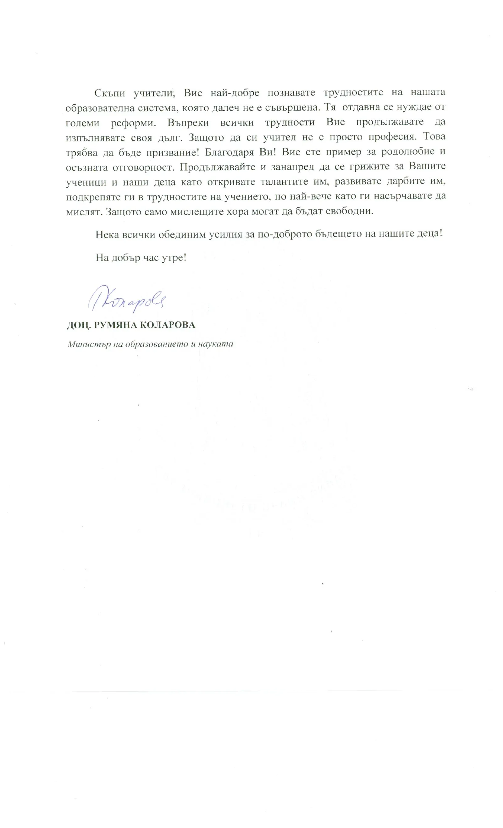 Приветствие от министъра на образованието и науката доц. Румяна Коларова