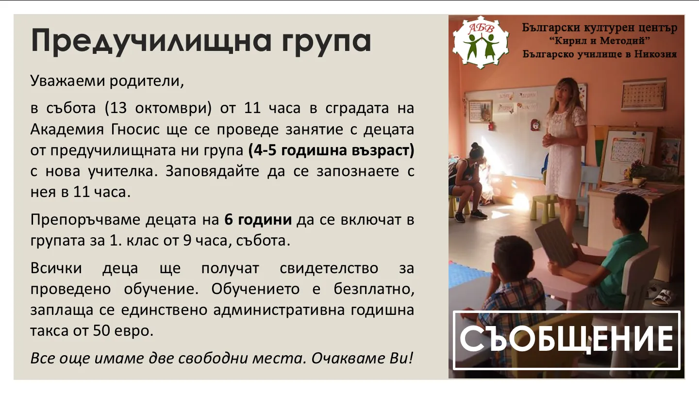 Уважаеми родители, в събота (13 октомври 2018) от 11 часа в сградата на Академия Гносис ще се проведе занятие с децата от предучилищната ни група (4-5 годишна възраст) с нова учителка. Заповядайте да се запознаете с нея в 11 часа. Препоръчваме децата на 6 години да се включат в групата за 1. клас от 9 часа, събота. Всички деца ще получат свидетелство за проведено обучение. Обучението е безплатно, заплаща се единствено административна годишна такса от 50 евро. Все още имаме две свободни места. Очакваме Ви!